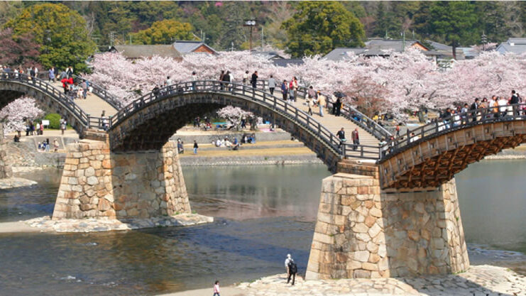Kintai Bridge is a historic wooden bridge surrounded by hundreds of cherry blossom trees. From late March to early April, the riverbanks turn pink with sakura blooms. The combination of the iconic bridge and cherry blossoms creates one of Japan’s most photogenic spring views.