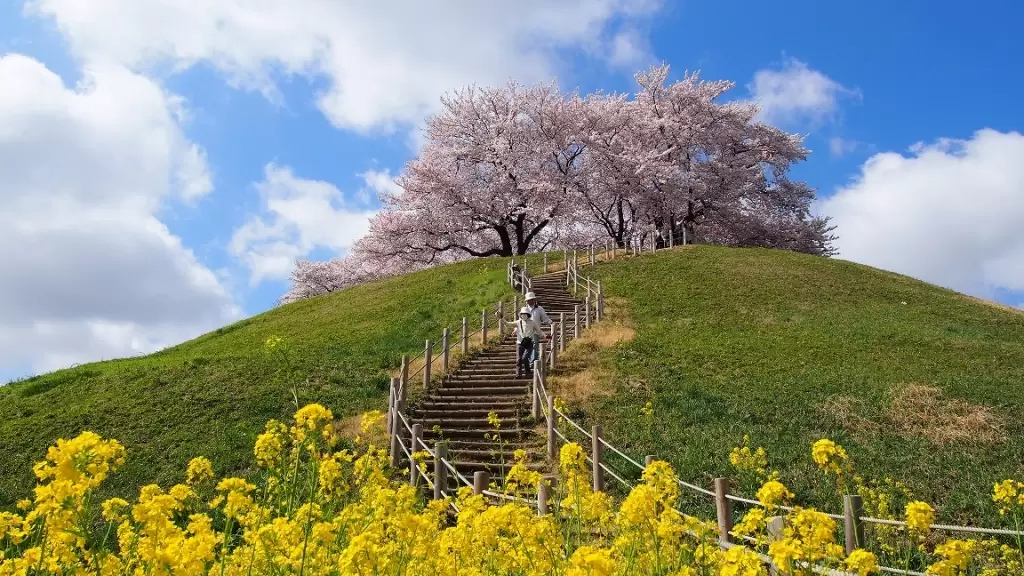 Sakitama Kofun Park is known for its ancient burial mounds surrounded by cherry blossom trees. The largest mound, Maruhakayama Kofun, offers a unique view of sakura blooming over historic kofun hills. It’s a great hidden gem for scenic spring photos.