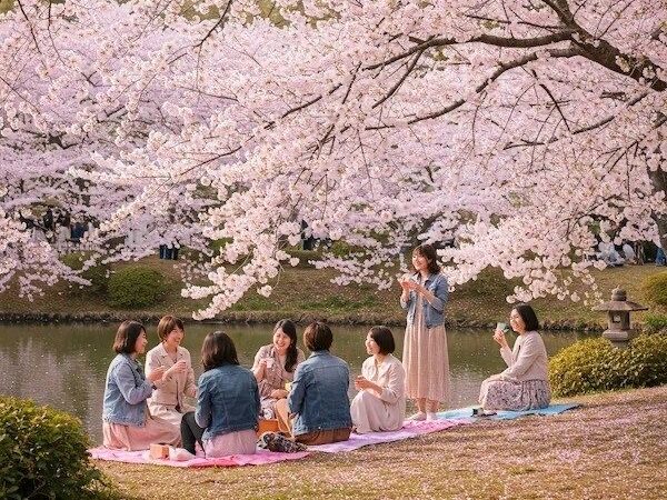 A Japanese tradition of enjoying the beauty of flowers, especially cherry blossoms, with picnics or parties under the blooming cherry trees in spring (late March-April).