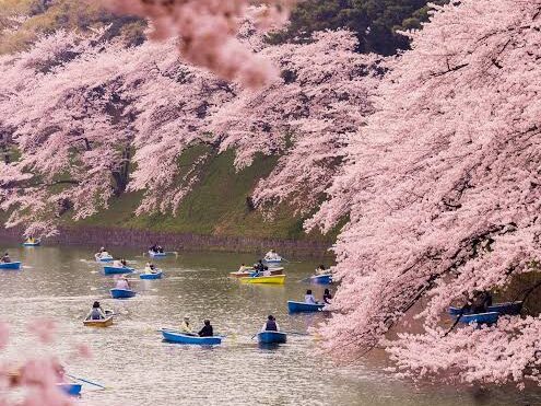 The experience of renting. a rowboat on the moat northwest of Tokyo’s Imperial Palace. Visitors can paddle beneath hundreds of cherry trees blooming and falling on the water, creating a romantic